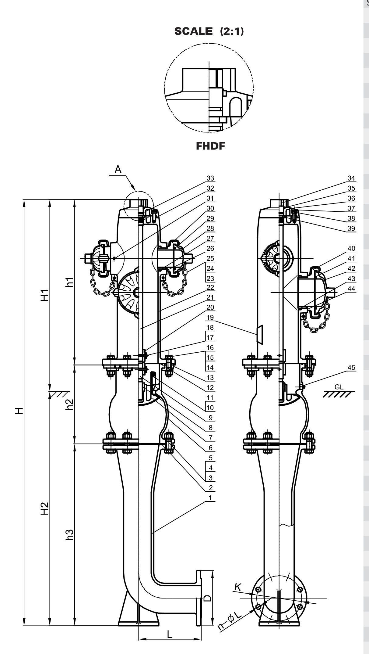 - Thân trụ: được đúc từ gang cầu FCD450, hai mặt được phủ bởi lớp sơn epoxy cao cấp với độ dày ≥300 μm. Thân có 02 phần, thân trên và thân dưới (bầu chứa lá van).